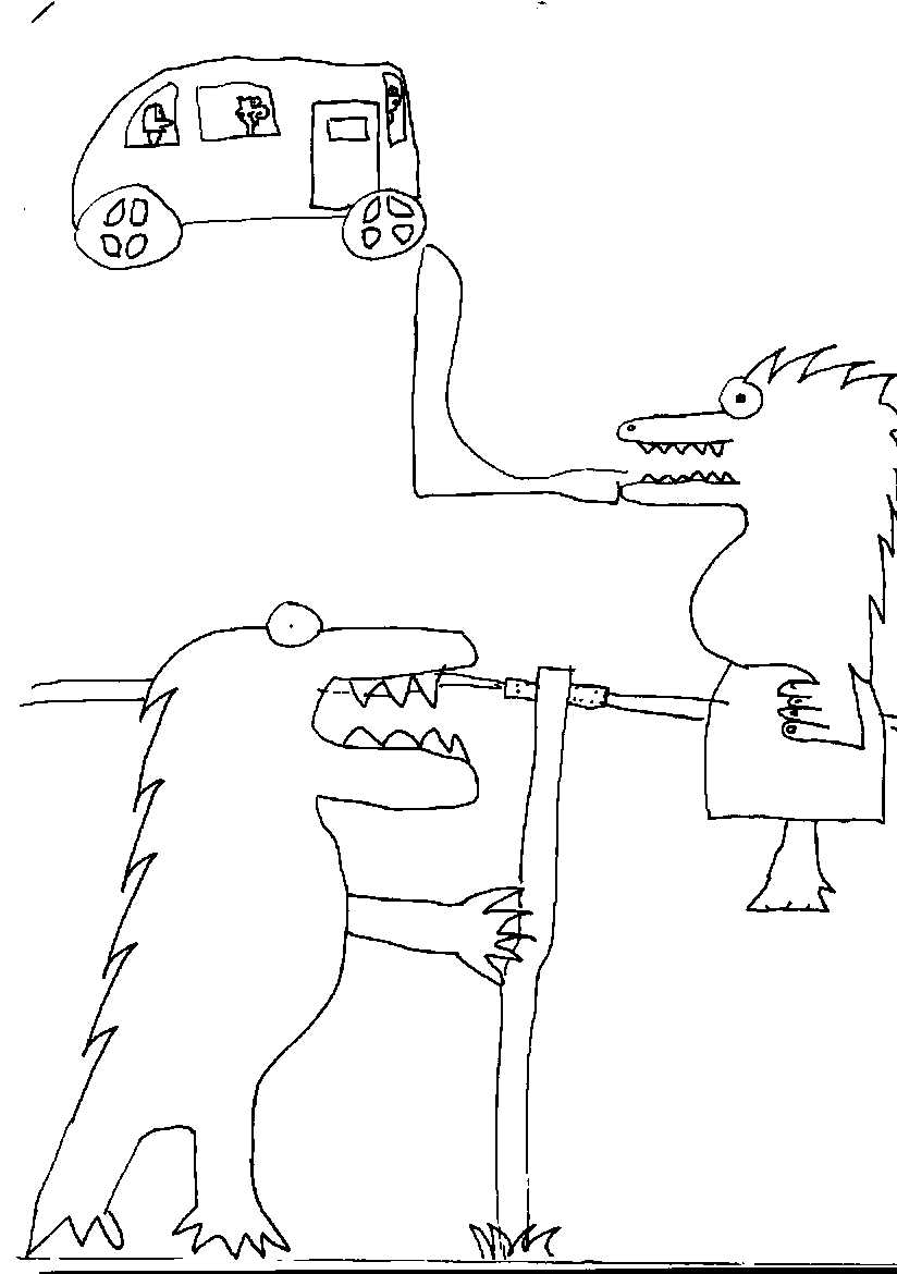 Maar toen de bus aankwam pakte Draga de bus ( Draga was de slechte zus van Drogo) en zij slokte hem op.
